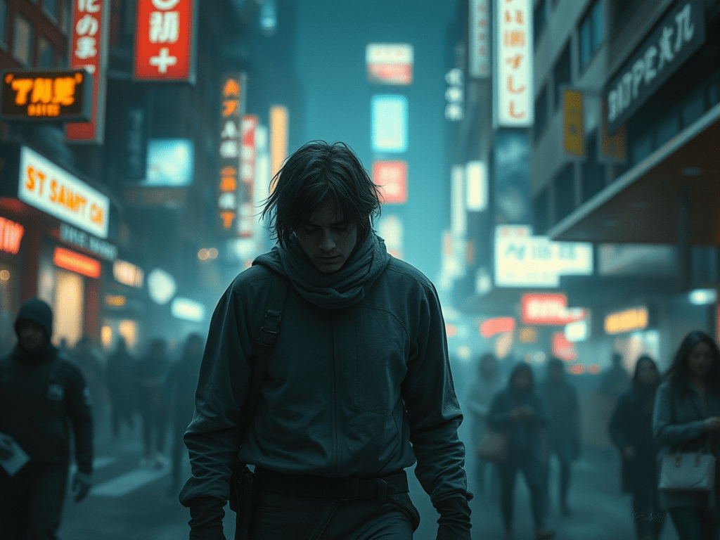 Through neon lights and heavy fumes.
